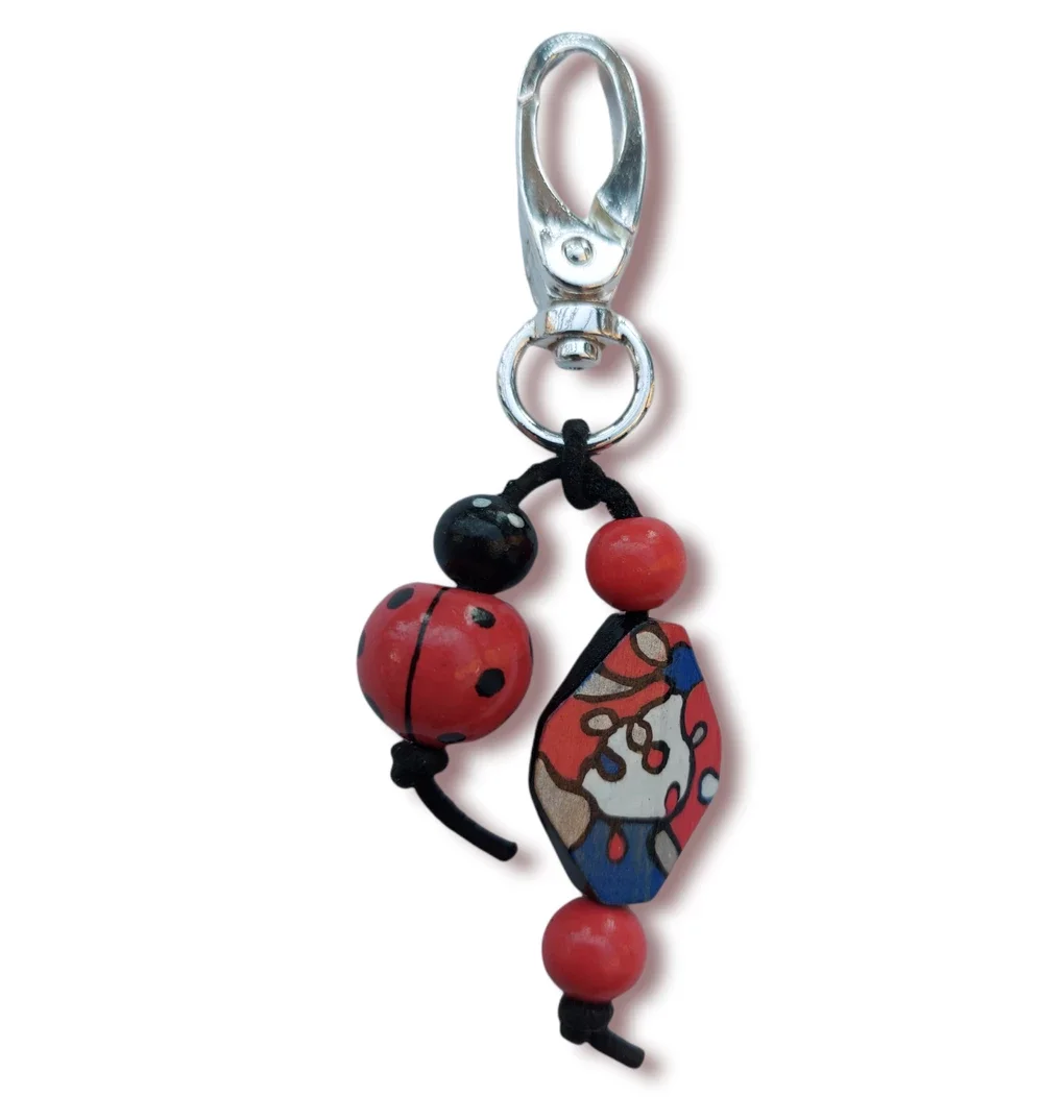 'Ladybug' De basis van de sleutelhanger bestaat uit verzilverd metaal. De sleutelhanger hangt aan elkaar met leder koord en de parels bestaan uit bewerkt hout en zelfgegoten parels uit een 100% ecologisch materiaal op basis van lava.